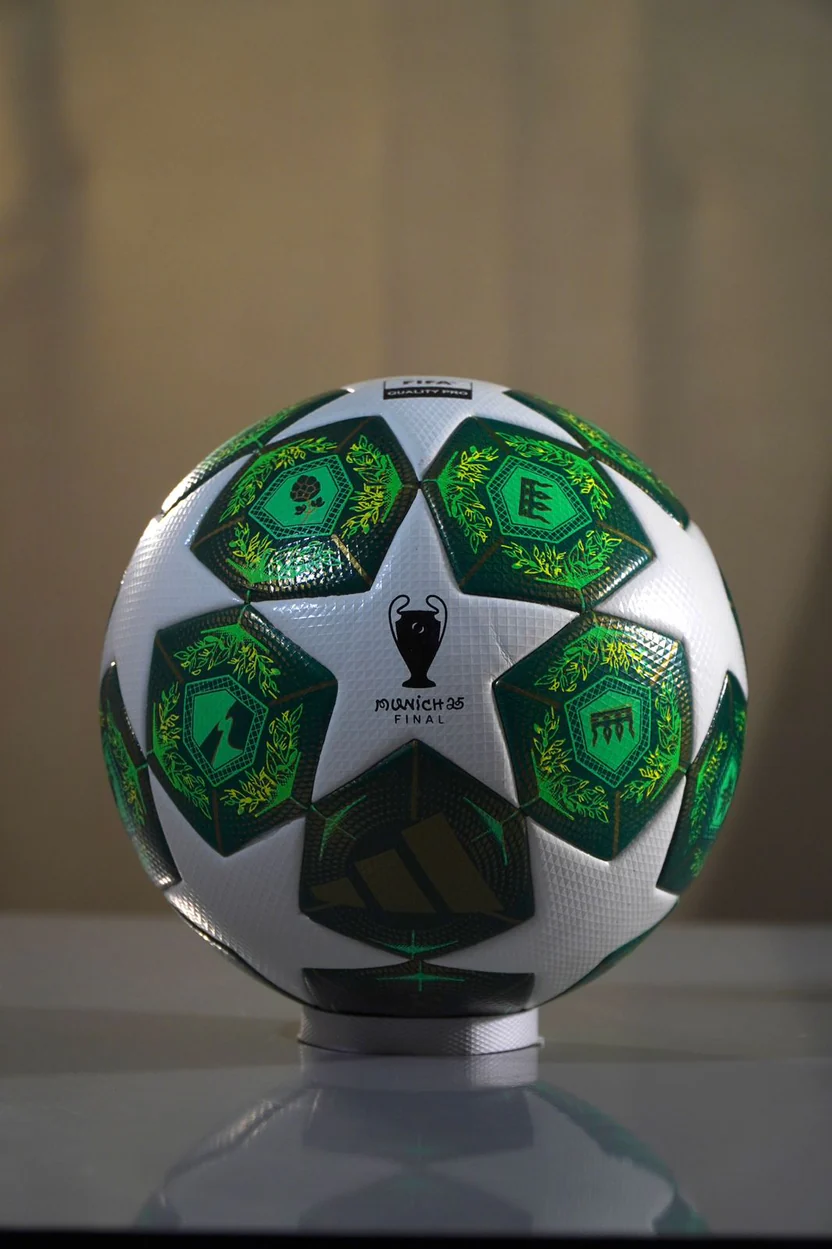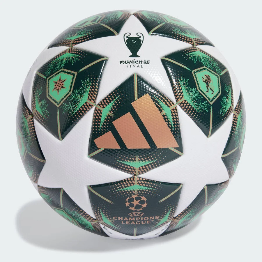 Inspired by Munich’s historic architecture and signature green copper domes, the design blends football heritage with modern performance engineering. The thermally bonded seamless panel construction reduces water absorption while ensuring a predictable trajectory during high-speed play.
